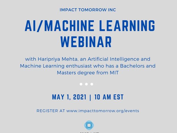 Join us on May 1st at 10 AM (EST) for an Artificial Intelligence and Machine Learning webinar with Haripriya Metha. Harpriya is an AI/ML enthusiast with a Bachelors and Masters from MIT.